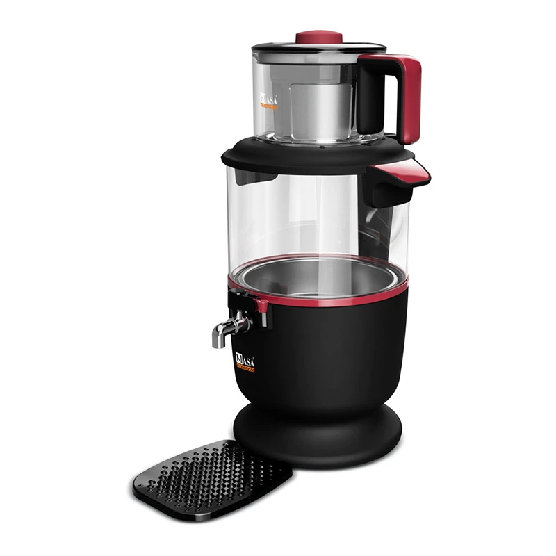 بدنه‌ی شفاف علاوه بر زیبایی، به شما امکان می‌دهد میزان آب و رنگ چای را به‌راحتی کنترل کنید. شیر خروجی استیل ضدچکه نیز تخلیه‌ی آب را کاملاً تمیز و بدون ریزش انجام می‌دهد.