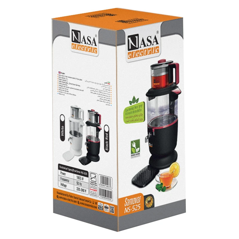 سماور برقی NS-525 از برند Nasa Electric ترکیبی است از طراحی مدرن، ایمنی بالا و کارایی چشمگیر. این محصول با توان حرارتی بالا، شیشه‌ی مقاوم، سیستم ایمنی هوشمند و ظاهری شیک، گزینه‌ای بی‌نقص برای خانواده‌هایی است که به کیفیت و زیبایی اهمیت می‌دهند.